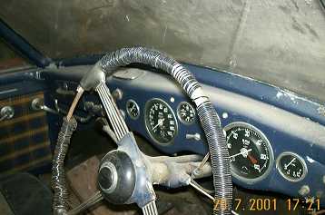Farina E1 SA 109R steering wheel accurately restored by John Blaze. Horn push, of course, is anachronistic (it was true to Jowetts from 1953) but nice. |